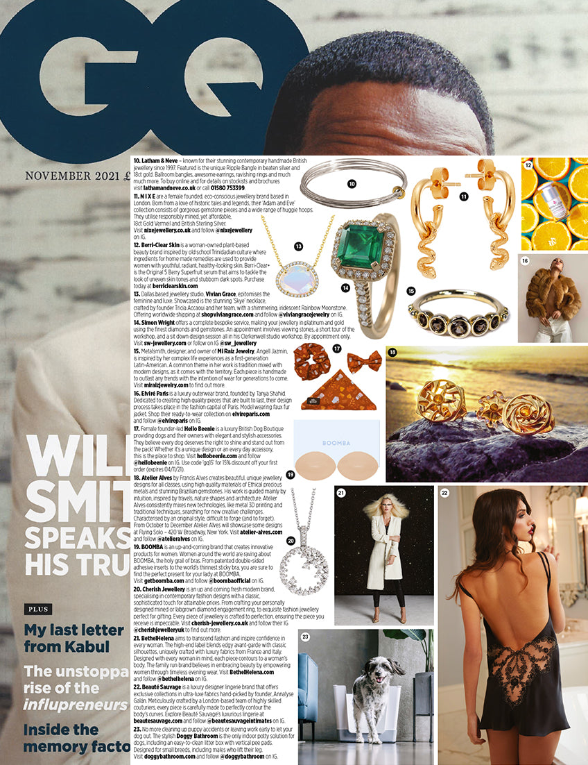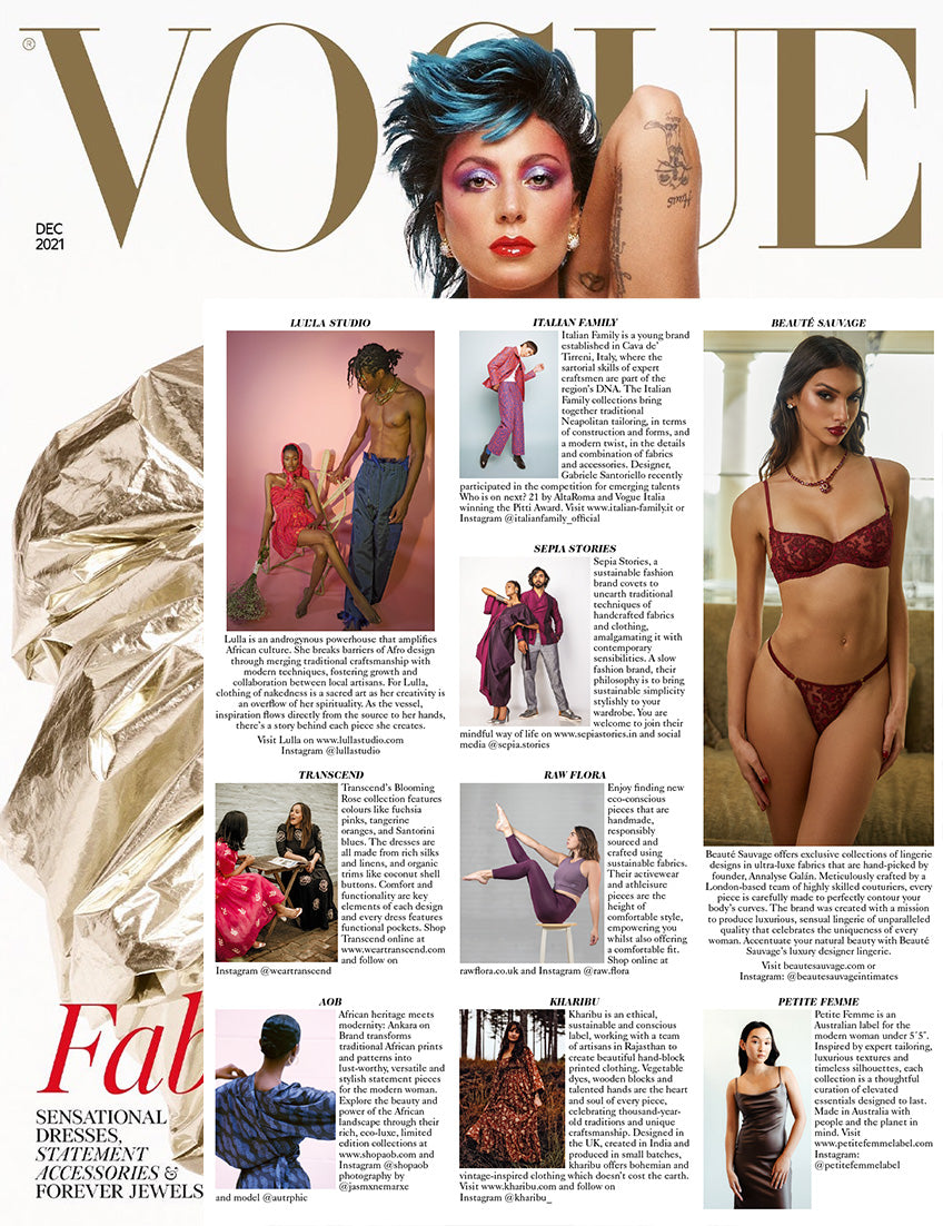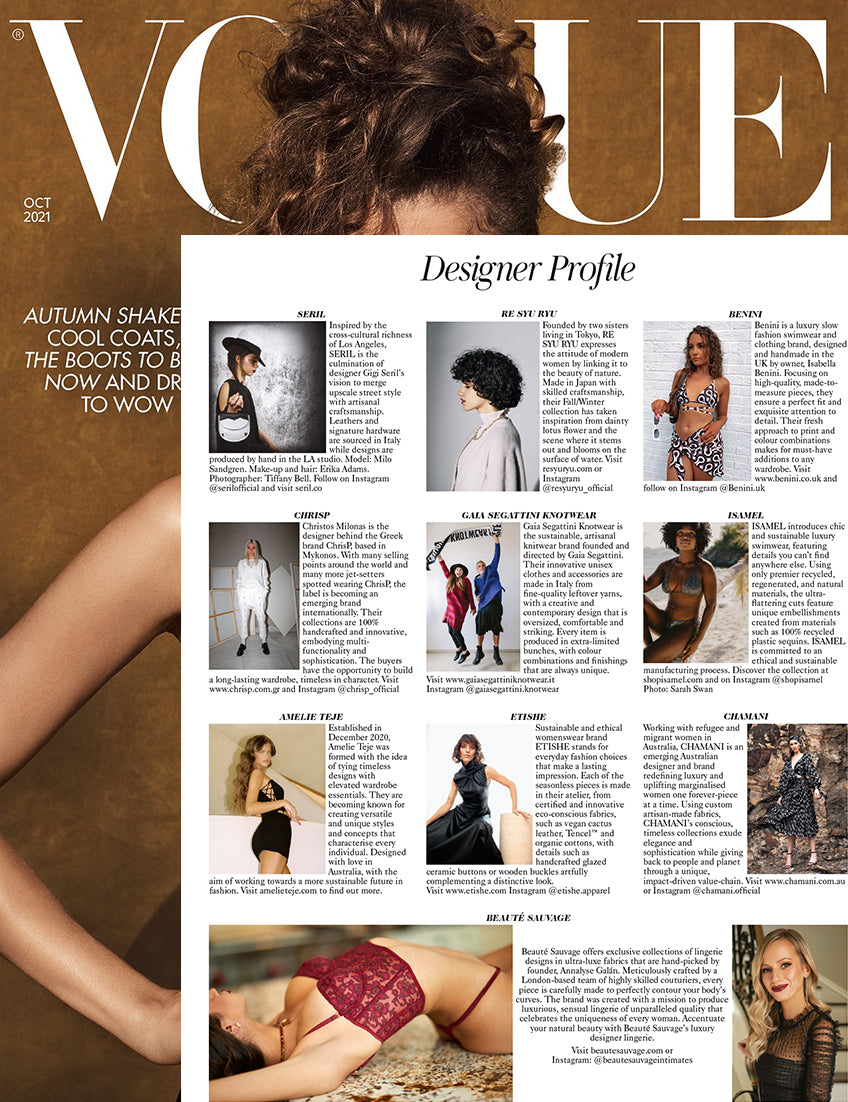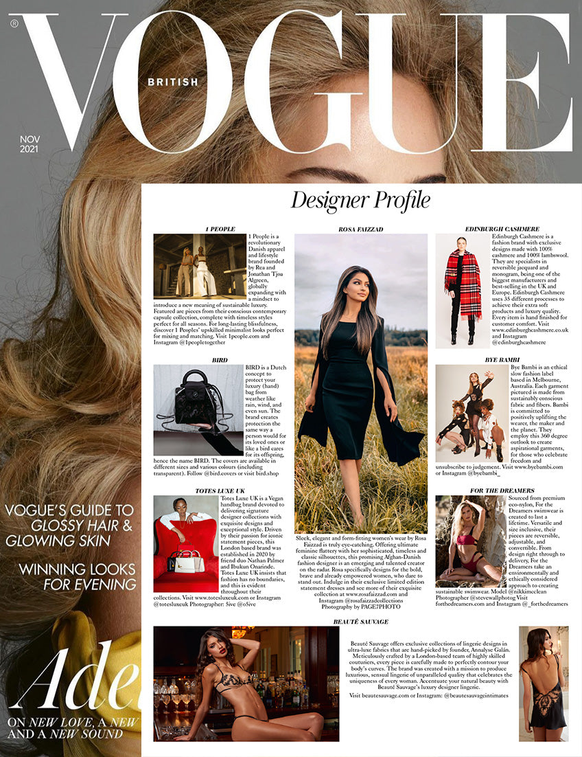 We were featured again in the November 2021 issue of Vogue in the designer profile. Our Cygne Noir line is delicate and comfortable - quality pieces that celebrate the uniqueness of every woman!
